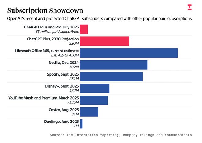 ▲OpenAI近期及2030年预测付费用户数与其他企业近期付费用户数对比(来源:The Information)