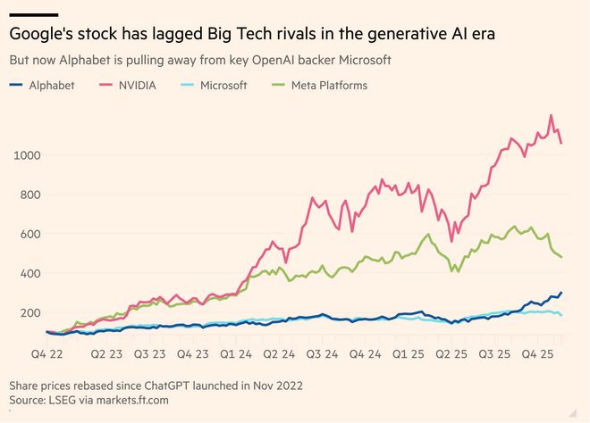 ▲谷歌母公司Alphabet的股价正逐渐超越OpenAI的有力支持者微软