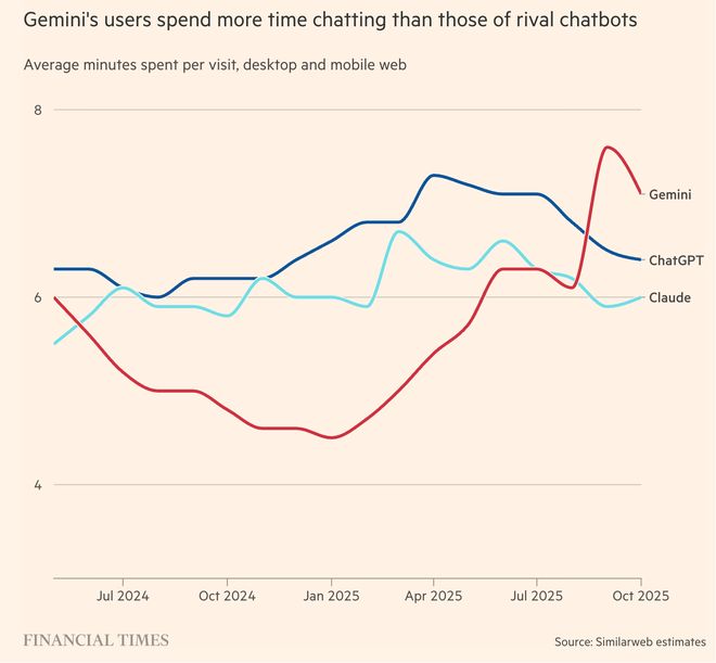 在数据方面,今年9月,Gemini App的月活跃用户达到7.8亿,较5月的2亿月活跃用户增长了290%,正逼近ChatGPT的月活跃用户数;在用户每次与AI对话的平均时长对比中,Gemini已领先于ChatGPT。