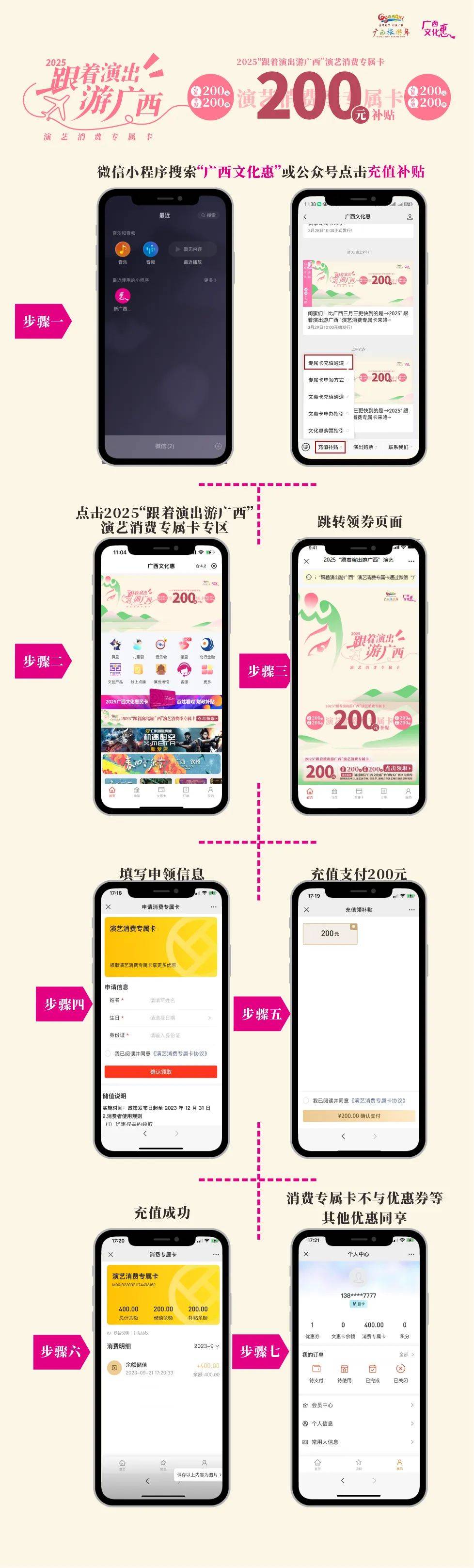 活动期间,区内外观众(游客)在“广西文化惠”平台(“广西文化惠”微信公众号、“广西文化惠”小程序、“一键游广西”演艺板块)填写姓名、身份证号、手机号码进行注册,注册完成后登录“跟着演出游广西”演艺消费专属卡专区,可申领充值200元赠送200元优惠权益。每位注册会员使用完充值和赠送金额(共400元)后,可再次领取优惠权益,每位注册会员每个周期最高可享受2次充值优惠权益。
